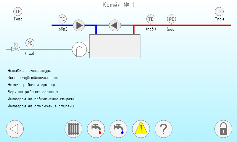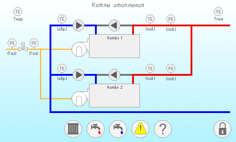 Газовые котлы управляются отдельными (локальными) шкафами автоматики с возможностью дистанционного управления. Каждый из котлов обеспечен собственным шкафом управления. Для передачи данных в основной шкаф используется сетевой интерфейс RS-485. Таким образом обеспечивается надёжность эксплуатации котельной в целом и предоставление всей необходимой информации на верхний уровень.